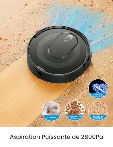 【Aspiration Puissante avec Moteur Sans Brosse】Équipé d’un moteur sans brosse haute performance, cet aspirateur laveur robot offre une forte aspiration de 2800 Pa, capable de soulever facilement la poussière, la saleté, les poils d’animaux et les débris des sols et des tapis à poils ras. Avec un niveau de bruit de 55 dB en mode standard, il ne vous dérangera pas, vous permettant de travailler sans souci. N’oubliez pas de vider régulièrement le bac à poussière.