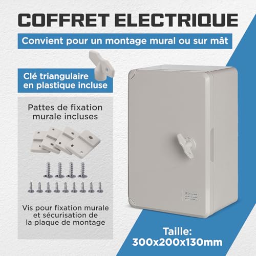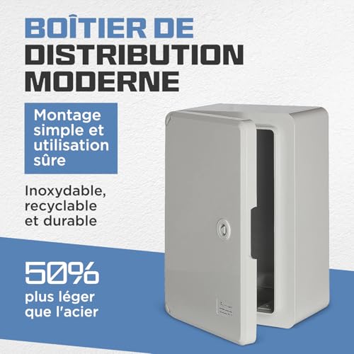 Porte pour une protection sûre : le coffret electrique etanche exterieu (dim. int.: 458x350x163mm) est équipé d’une porte robuste & d’un verrou à clé triangulaire. Poids : 4,3 kg