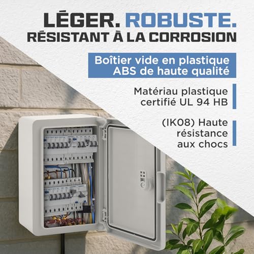 Porte pour une protection sûre : le coffret electrique etanche exterieu (dim. int.: 458x350x163mm) est équipé d’une porte robuste & d’un verrou à clé triangulaire. Poids : 4,3 kg Boîtier léger & robuste : le boîtier electrique en plastique ABS réduit le poids jusqu’à 50% vs. tôle d’acier. Étanche à l’extérieur – simple à manipuler & transporter. Haute résistance aux chocs + intempéries : certifié IK08 avec joint PUR – parfait comme armoire electrique extérieure pour les usages industriels exigeants.