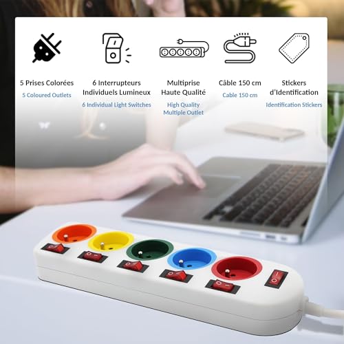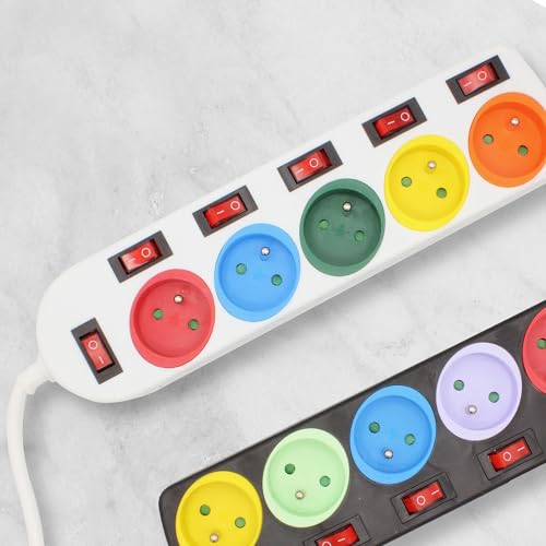 FISHTEC Multiprises Electriques 5 Prises Couleur – Bloc Multiprise Couleur – Interrupteur Général + pour Chaque Sortie + Stickers