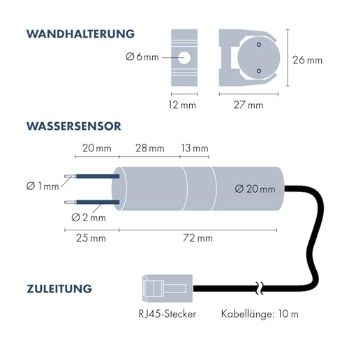 Spécifications : Tension de fonctionnement : 230 V/50 – 60 Hz, Puissance absorbée : max. 1,5 W, Capacité de commutation : max. 3000 W, Sensibilité d’entrée : 50 kohm, eau Capteur de détection : RJ 45 Jack, classe de protection : IP 20, gamme de fonctionnement : -15 °C – + 40 °C