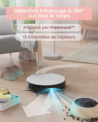 【Anti-choc et Anti-chute】: 13 Ensembles de capteurs infrarouges polyvalents, 2 ensembles de capteurs le long du mur et 3 ensembles de capteurs au sol permettent au robot N1 d’évaluer rapidement l’environnement de nettoyage, d’ajuster intelligemment le chemin de nettoyage pour éviter de tomber des escaliers et d’endommager les meubles.