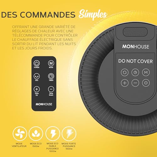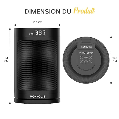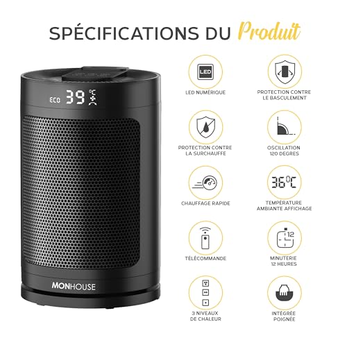 MONHOUSE Radiateur Electrique Céramique Oscillant 120° MONHOUSE Avec Thermostat, Minuterie 1-12 Heures, Télécommande, Protection Contre La Surchauffe Et l’inclinaison, Mode ECO D’économie D’énergie