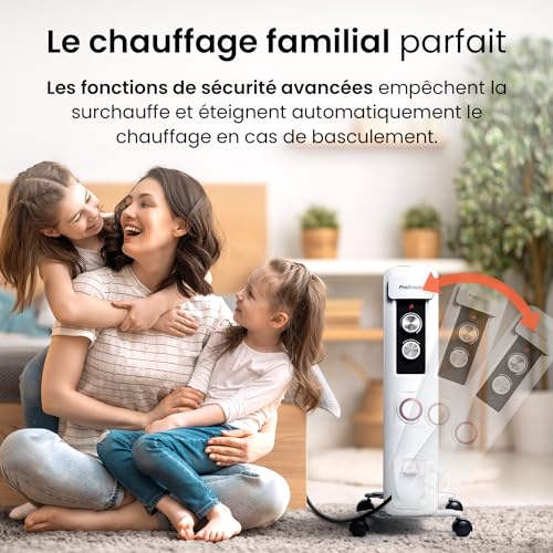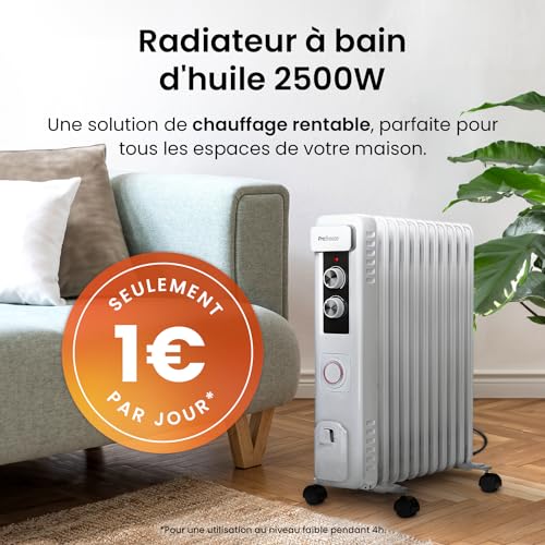 UN CHAUFFAGE PUISSANT : Ce radiateur à bain d’huile 2500W Pro Breeze est doté de 11 puissantes ailettes qui font circuler rapidement et efficacement l’air chaud dans toute la maison, le bureau ou le salon. Les radiateurs remplis d’huile sont idéaux pour les pièces qui ont besoin d’être chauffées pendant une longue période, car ils offrent une solution de chauffage peu honéreuse comparé au fonctionnement d’un radiateur soufflant. CHALEUR PERSONNALISÉE EN QUELQUES SECONDES : Ce radiateur électrique est doté d’un thermostat réglable, qui vous permet de choisir entre 3 niveaux de chaleur – 2500W, 1500W et 1000W. Une minuterie numérique…