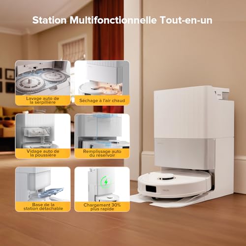 Révolutionne le nettoyage mains libres : Vidange automatique de la poussière dans un bac de stockage de 7 semaines, lavage automatique des serpillières et séchage à l’air chaud pour éviter les odeurs. Le réservoir d’eau se remplit automatiquement pour un nettoyage ininterrompu sur 330 m², ce qui est parfait pour les grandes maisons. L’air chaud aide la serpillière à sécher rapidement et évite les odeurs