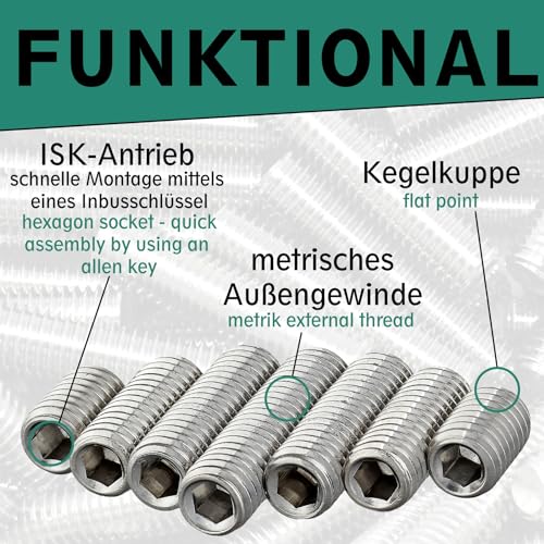 Vis sans tête avec embout conique et six pans creux (ISK) conforme à la norme DIN 913 / ISO 4026, acier inoxydable A2 V2A, vis sans tête, taille au choix